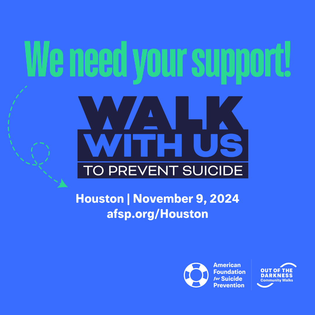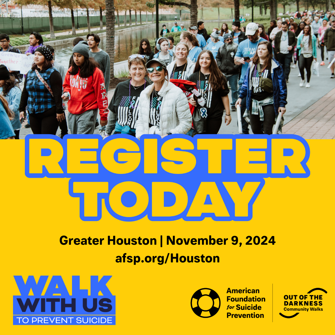 Back to All Events 2024 Out of the Darkness Walk in The Woodlands Saturday, November 9, 2024 8:00 AM 1:00 PM Google Calendar ICS Register: afsp.org/houstonClick Here For More Info!